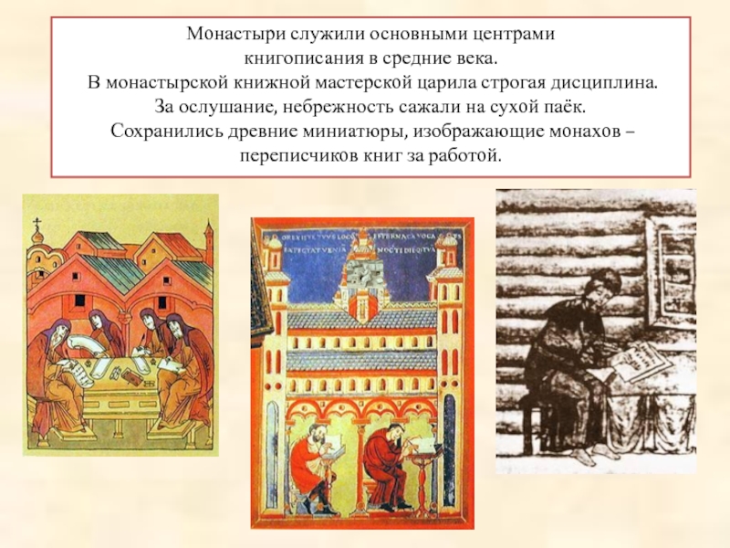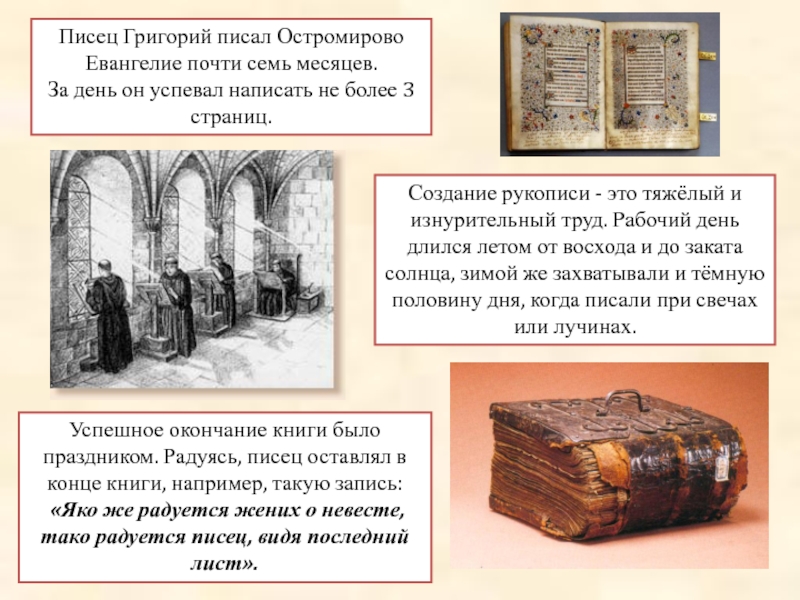 Создание рукописи - это тяжёлый и изнурительный труд. Рабочий день длился летом от восхода и до заката солнца, зимой же захватывали и тёмную половину дня, когда писали при свечах или лучинах.