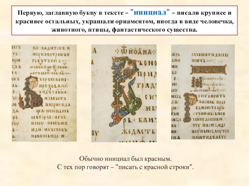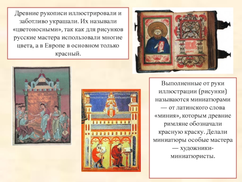 Выполненные от руки иллюстрации (рисунки) называются миниатюрами — от латинского слова «миния», которым древние римляне обозначали красную краску. Делали миниатюры особые мастера — художники-миниатюристы.
