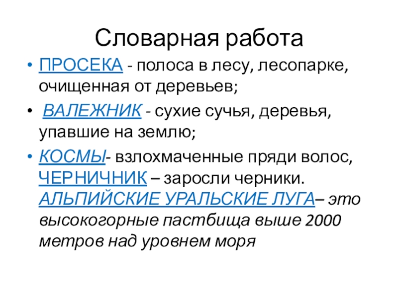 КОСМЫ- взлохмаченные пряди волос, ЧЕРНИЧНИК – заросли черники. АЛЬПИЙСКИЕ УРАЛЬСКИЕ ЛУГА– это высокогорные пастбища выше 2000 метров над уровнем моря