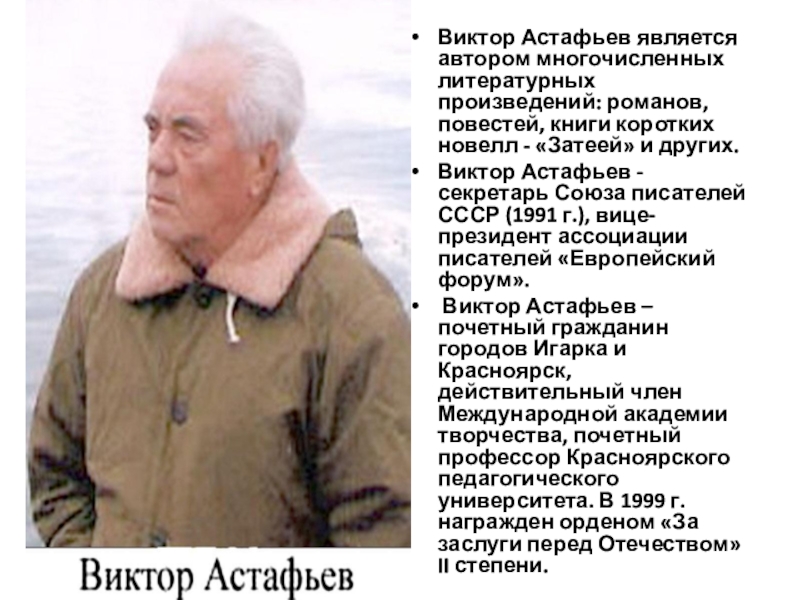 Слайд 15Виктор Астафьев является автором многочисленных литературных произведений: романов, повестей, книги коротких