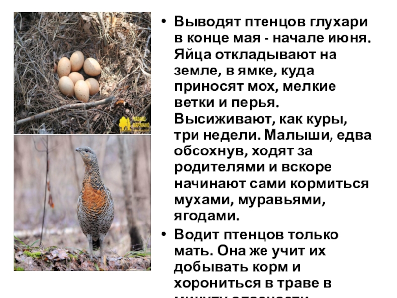 Слайд 8Выводят птенцов глухари в конце мая - начале июня. Яйца откладывают