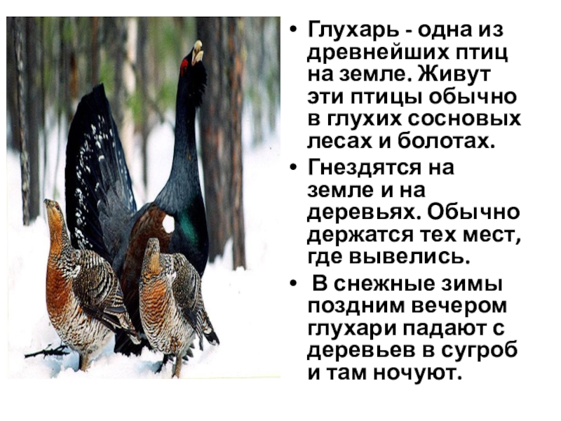 Слайд 7Глухарь - одна из древнейших птиц на земле. Живут эти птицы