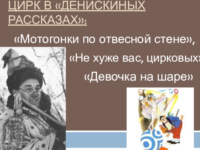Цирк в «Денискиных рассказах»:«Не хуже вас, цирковых»,«Мотогонки по отвесной стене»,«Девочка на шаре»