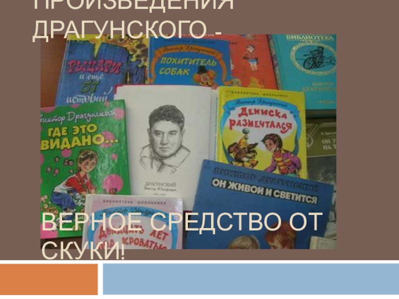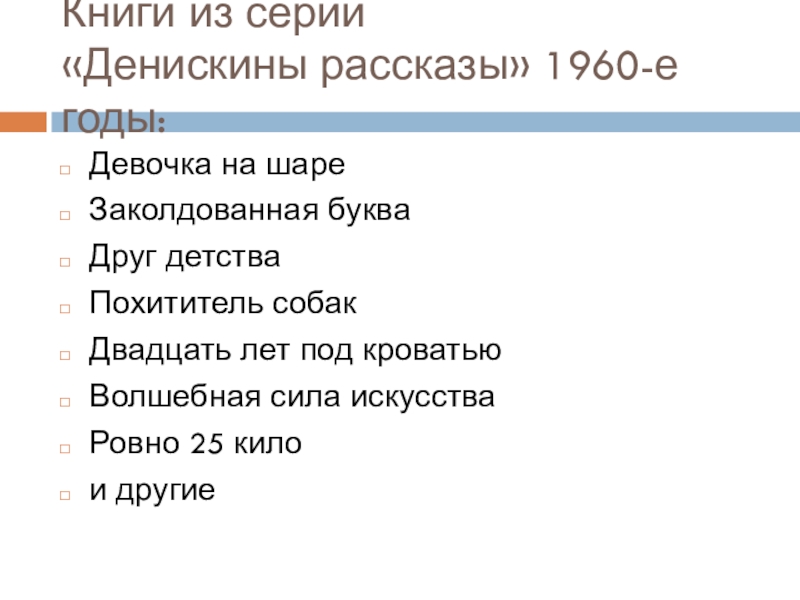 Книги из серии «Денискины рассказы» 1960-е годы:Девочка на шареЗаколдованная букваДруг детстваПохититель собакДвадцать лет под кроватьюВолшебная сила искусстваРовно