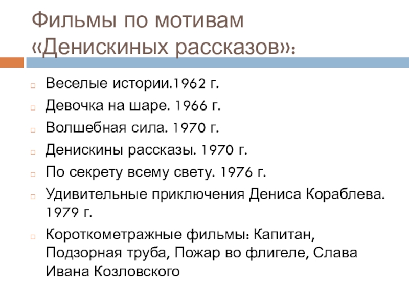 Фильмы по мотивам «Денискиных рассказов»:Веселые истории.1962 г.Девочка на шаре. 1966 г.Волшебная сила. 1970 г.Денискины рассказы. 1970 г.По
