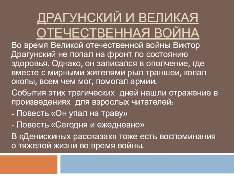 Драгунский и Великая Отечественная войнаВо время Великой отечественной войны Виктор Драгунский не попал на фронт по состоянию