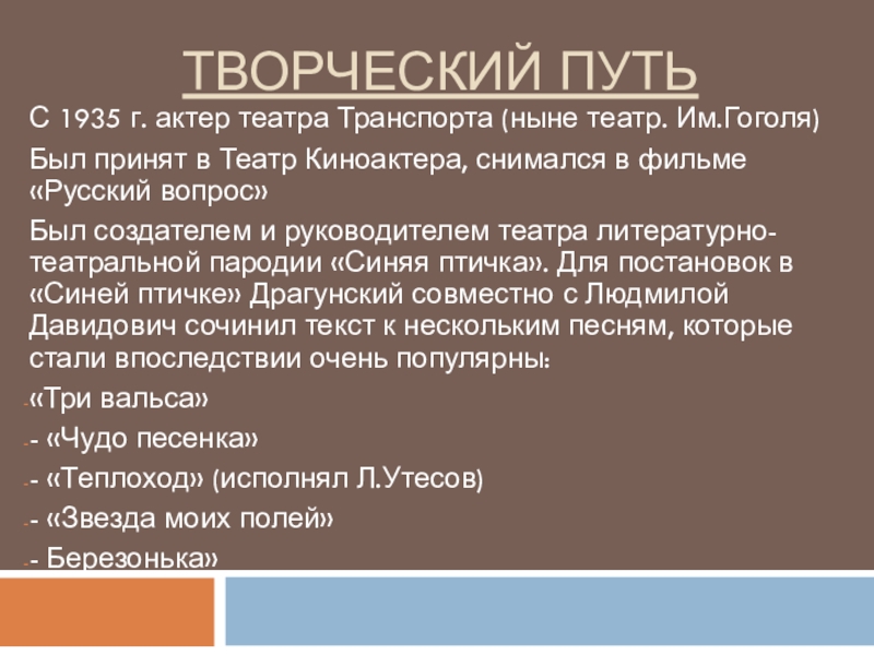 Был создателем и руководителем театра литературно-театральной пародии «Синяя птичка». Для постановок в «Синей птичке» Драгунский совместно с Людмилой Давидович сочинил текст к нескольким песням, которые стали впоследствии очень популярны: