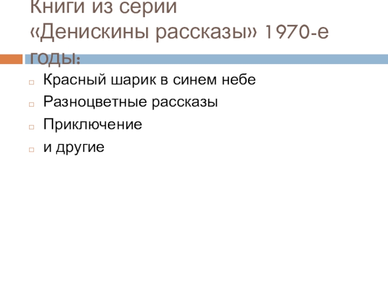 Книги из серии «Денискины рассказы» 1970-е годы:Красный шарик в синем небеРазноцветные рассказыПриключениеи другие