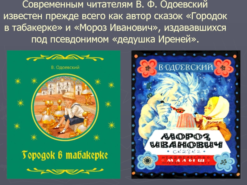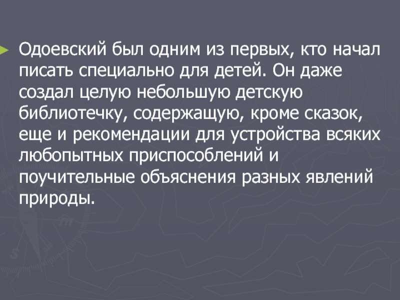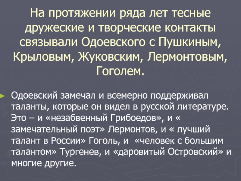 Одоевский замечал и всемерно поддерживал таланты, которые он видел в русской литературе. Это – и «незабвенный Грибоедов», и « замечательный поэт» Лермонтов, и « лучший талант в России» Гоголь, и «человек с большим талантом» Тургенев, и «даровитый Островский» и многие другие.