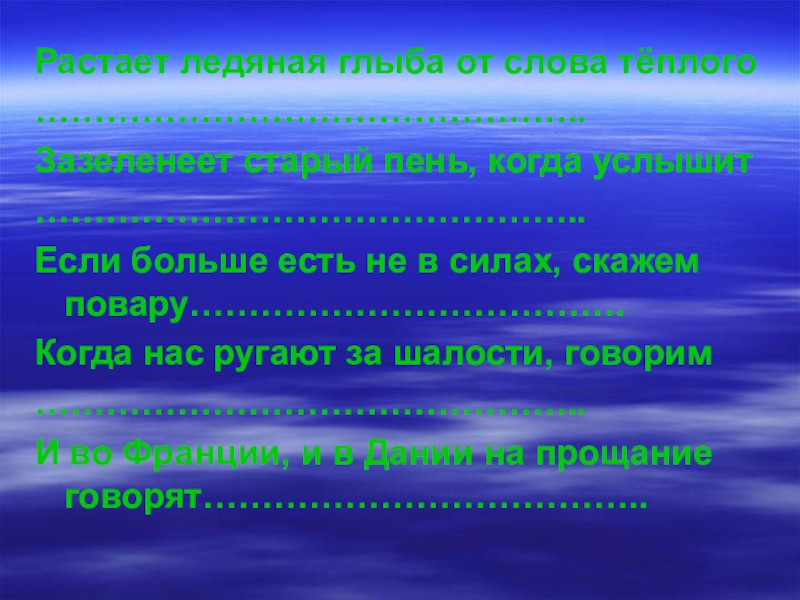 Растает ледяная глыба от слова тёплого………………………………………..Зазеленеет старый пень, когда услышит………………………………………..Если больше есть не в силах, скажем повару……………………………….Когда