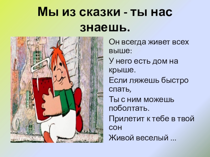 Мы из сказки - ты нас знаешь. Он всегда живет всех выше:У него есть дом на крыше.Если