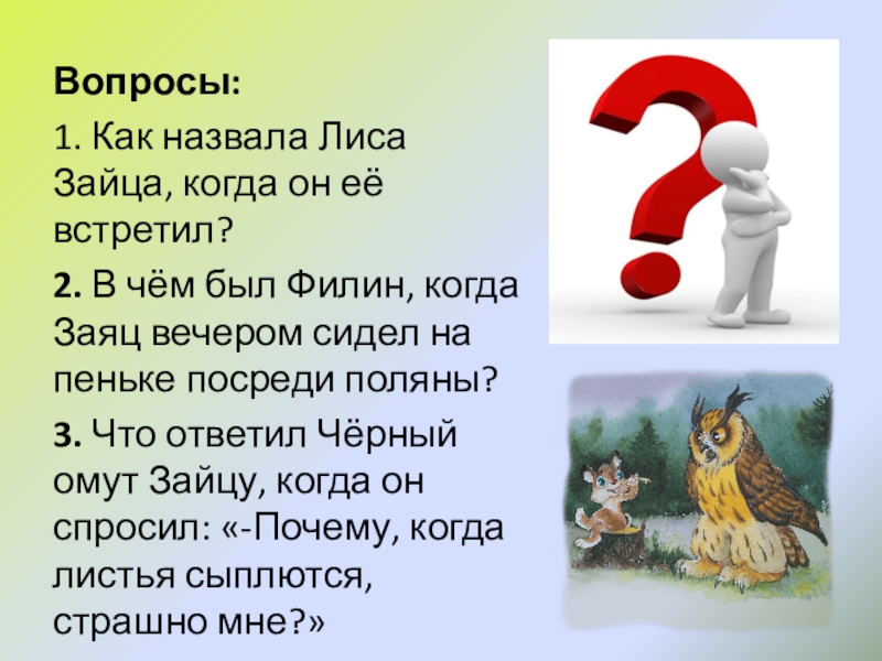 Вопросы: 1. Как назвала Лиса Зайца, когда он её встретил?2. В чём был Филин, когда Заяц вечером