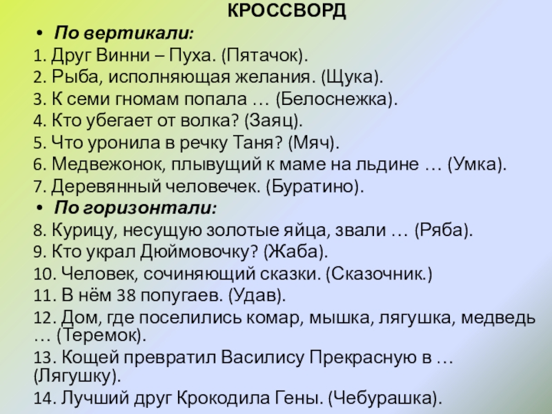 КРОССВОРДПо вертикали:1. Друг Винни – Пуха. (Пятачок).2. Рыба, исполняющая желания. (Щука).3. К семи гномам попала … (Белоснежка).4.