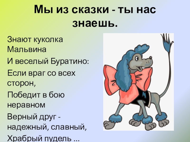 Мы из сказки - ты нас знаешь. Знают куколка МальвинаИ веселый Буратино:Если враг со всех сторон,Победит в