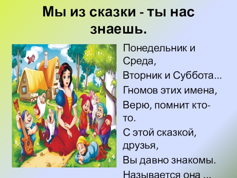 Мы из сказки - ты нас знаешь. Понедельник и Среда,    Вторник и Суббота...Гномов этих