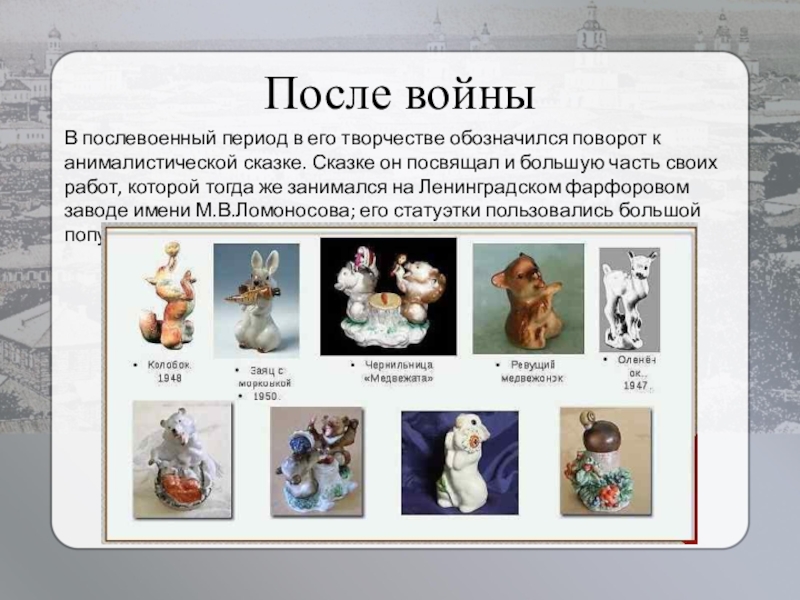 сказке. Сказке он посвящал и большую часть своих работ, которой тогда же занимался на Ленинградском фарфоровом заводе имени М.В.Ломоносова; его статуэтки пользовались большой популярностью.