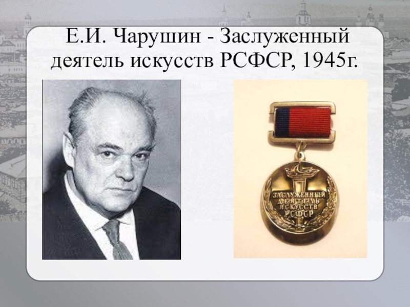 Слайд 11 Е.И. Чарушин - Заслуженный деятель искусств РСФСР, 1945г.