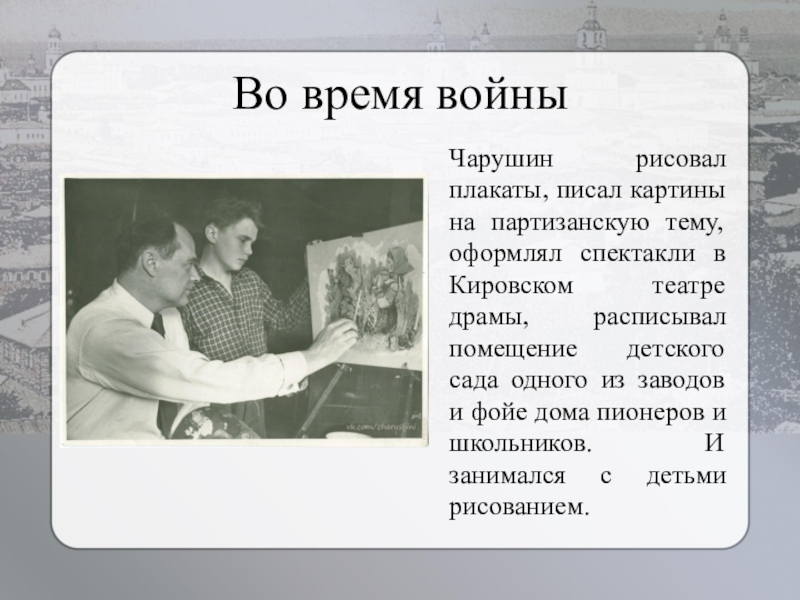 Во время войныЧарушин рисовал плакаты, писал картины на партизанскую тему, оформлял спектакли в Кировском театре драмы, расписывал