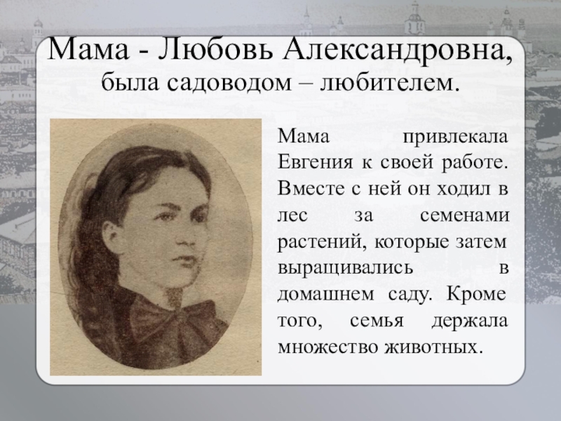 Мама - Любовь Александровна, была садоводом – любителем.Мама привлекала Евгения к своей работе. Вместе с ней он