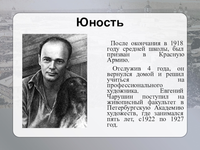 Отслужив 4 года, он вернулся домой и решил учиться на профессионального художника. Евгений Чарушин поступил на живописный факультет в Петербургскую Академию художеств, где занимался пять лет, с1922 по 1927 год.
