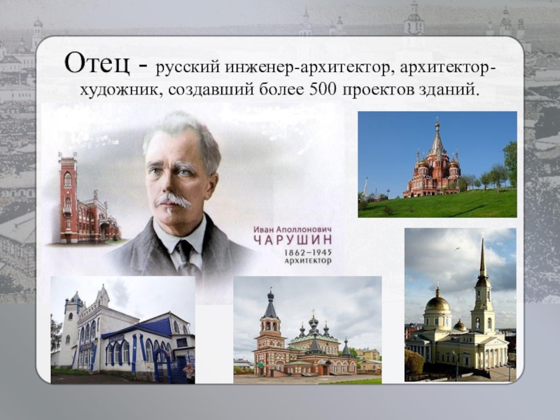 Слайд 3Отец - русский инженер-архитектор, архитектор-художник, создавший более 500 проектов зданий.