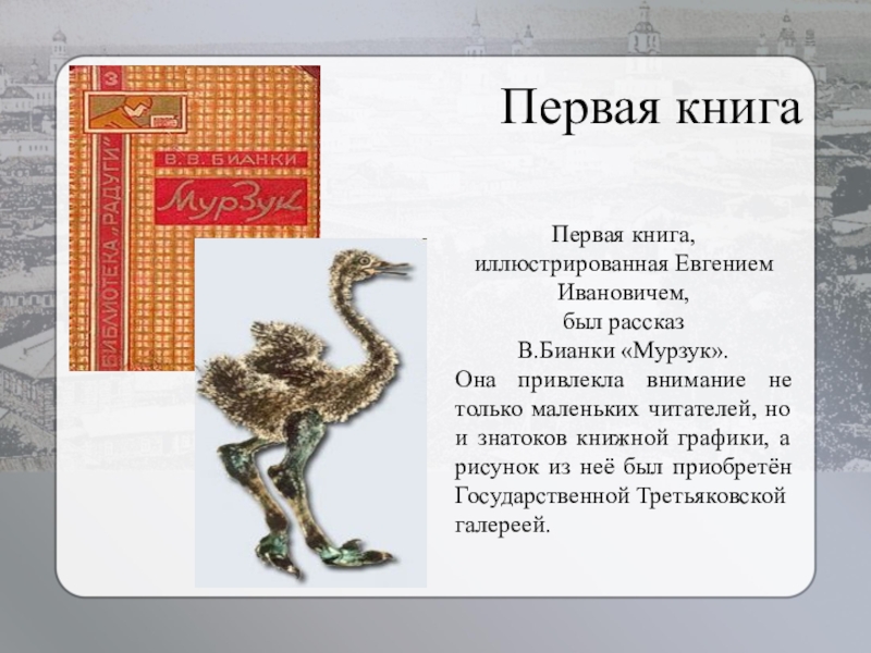 Первая книга Первая книга, иллюстрированная Евгением Ивановичем, был рассказ В.Бианки «Мурзук». Она привлекла внимание не только маленьких