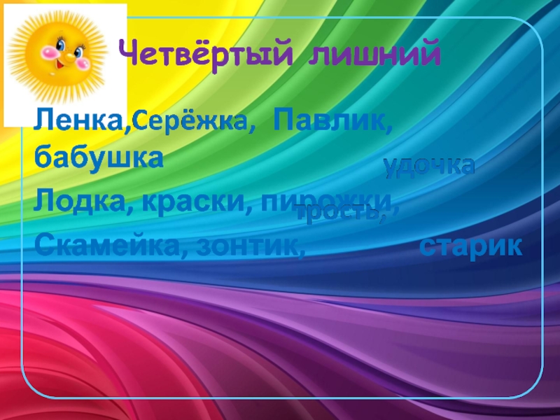 Четвёртый лишнийЛенка,          Павлик, бабушкаЛодка, краски, пирожки, Скамейка, зонтик,