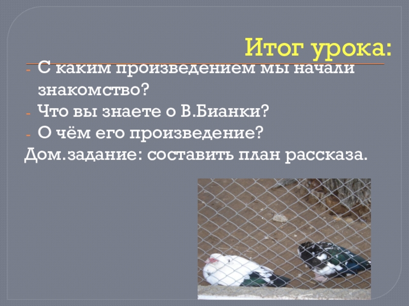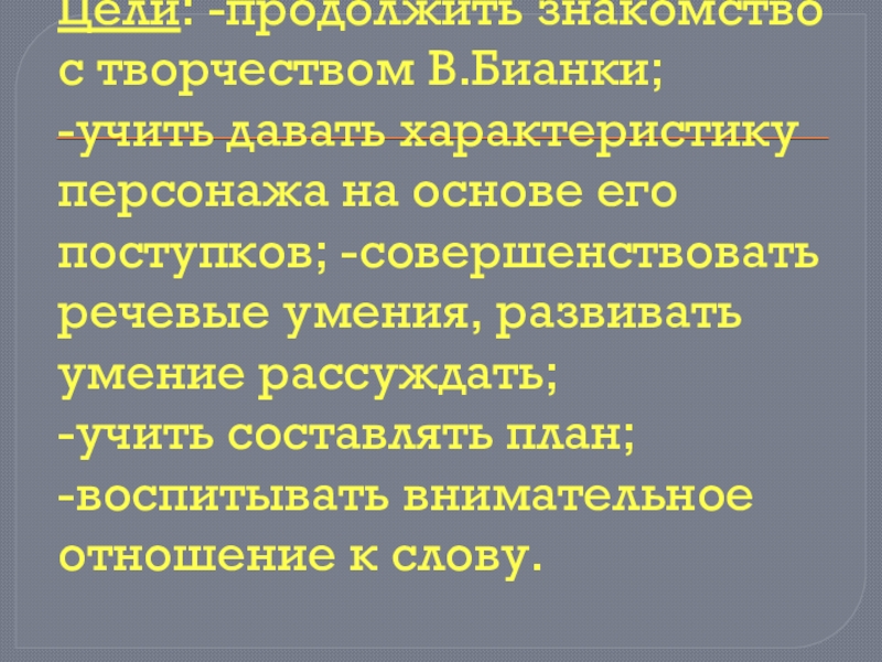 Слайд 4Цели: -продолжить знакомство с творчеством В.Бианки;