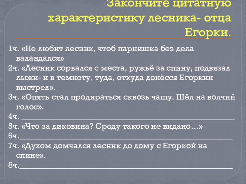 Слайд 15Закончите цитатную характеристику лесника- отца Егорки.