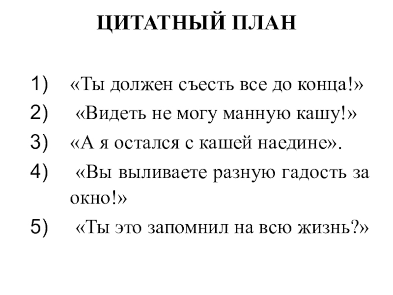 Цитатный план «Ты должен съесть все до конца!» «Видеть не могу манную кашу!»«А я остался с кашей