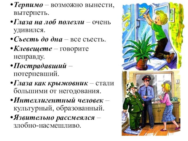 Терпимо – возможно вынести, вытерпеть.Глаза на лоб полезли – очень удивился.Съесть до дна – все съесть.Клевещете – говорите неправду.Пострадавший – потерпевший.Глаза как крыжовник – стали большими от негодования.Интеллигентный человек – культурный, образованный.Язвительно рассмеялся – злобно-насмешливо.