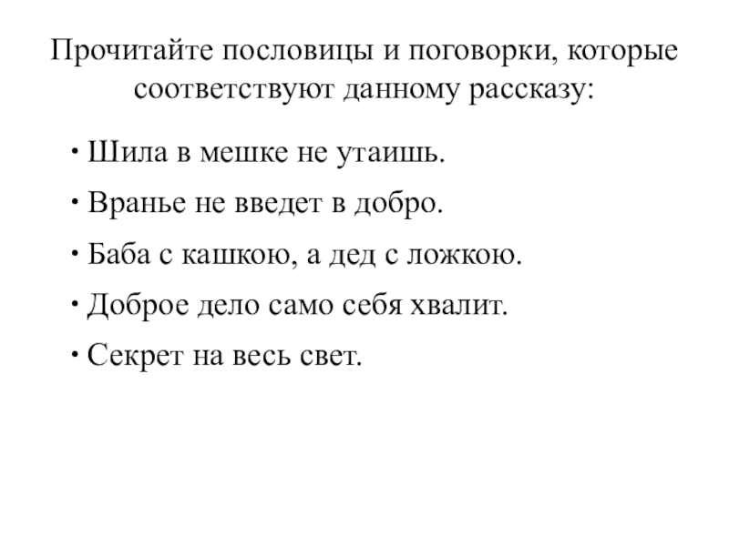 Прочитайте пословицы и поговорки, которые соответствуют данному рассказу:· Шила в мешке не утаишь.· Вранье не введет в