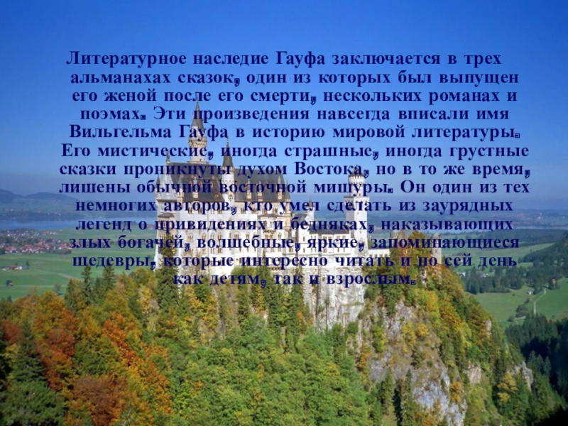 Именно для детей министра под влиянием творчества своего великого современника Эрнста Теодора Амадея Гофмана Гауф создает свой первый сборник детских сказок, увидевший свет в 1826 году. Сборник сразу же начинает пользоваться огромной популярностью у немецкоязычных читателей, вскоре его переводят на многие языки мира.