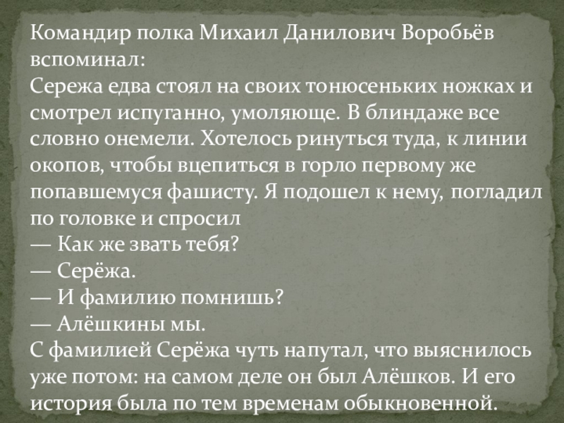 С фамилией Серёжа чуть напутал, что выяснилось уже потом: на самом деле он был Алёшков. И его история была по тем временам обыкновенной.