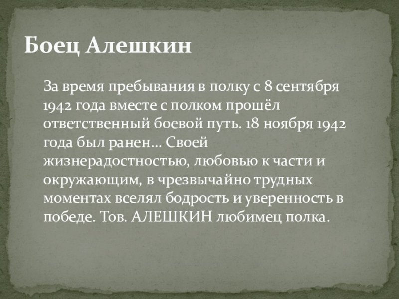вместе с полком прошёл ответственный боевой путь. 18 ноября 1942 года был ранен… Своей жизнерадостностью, любовью к части и окружающим, в чрезвычайно трудных моментах вселял бодрость и уверенность в победе. Тов. АЛЕШКИН любимец полка.