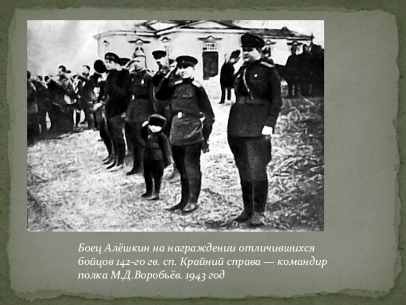 Слайд 36Боец Алёшкин на награждении отличившихся бойцов 142-го гв. сп. Крайний справа