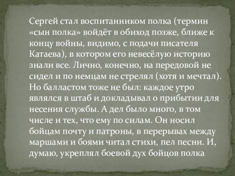 ближе к концу войны, видимо, с подачи писателя Катаева), в котором его невесёлую историю знали все. Лично, конечно, на передовой не сидел и по немцам не стрелял (хотя и мечтал). Но балластом тоже не был: каждое утро являлся в штаб и докладывал о прибытии для несения службы. А дел было много, в том числе и тех, что ему по силам. Он носил бойцам почту и патроны, в перерывах между маршами и боями читал стихи, пел песни. И, думаю, укреплял боевой дух бойцов полка