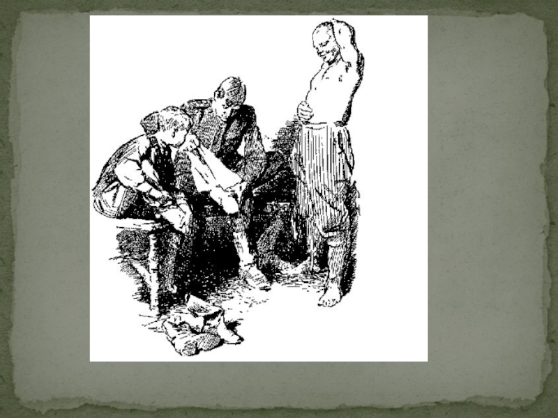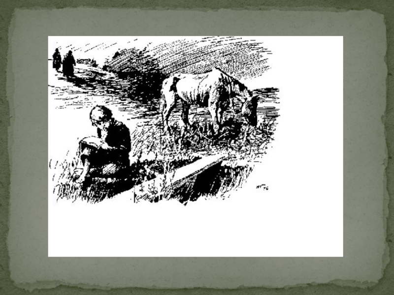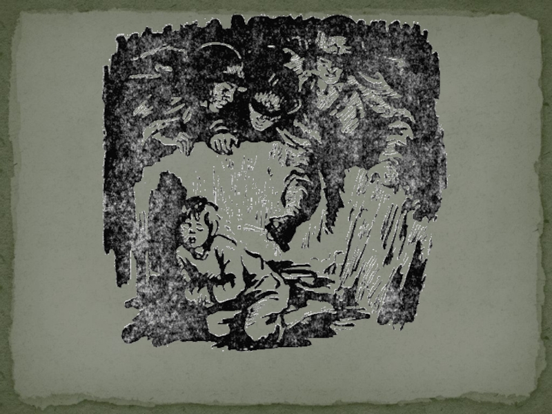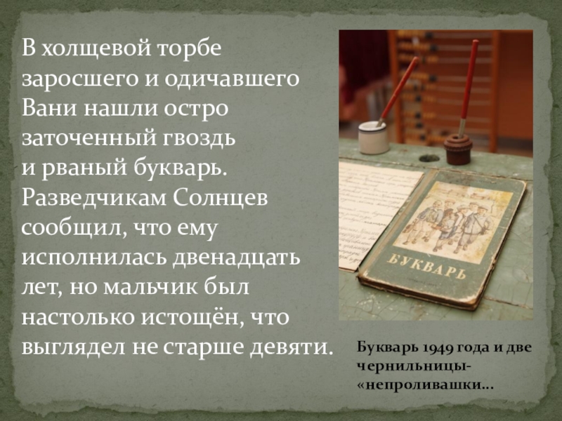 Слайд 8В холщевой торбе заросшего и одичавшего Вани нашли остро заточенный гвоздь и рваный букварь.