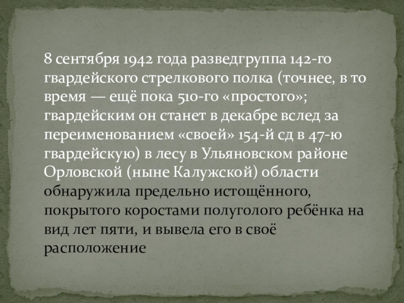 то время — ещё пока 510-го «простого»; гвардейским он станет в декабре вслед за переименованием «своей» 154-й сд в 47-ю гвардейскую) в лесу в Ульяновском районе Орловской (ныне Калужской) области обнаружила предельно истощённого, покрытого коростами полуголого ребёнка на вид лет пяти, и вывела его в своё расположение