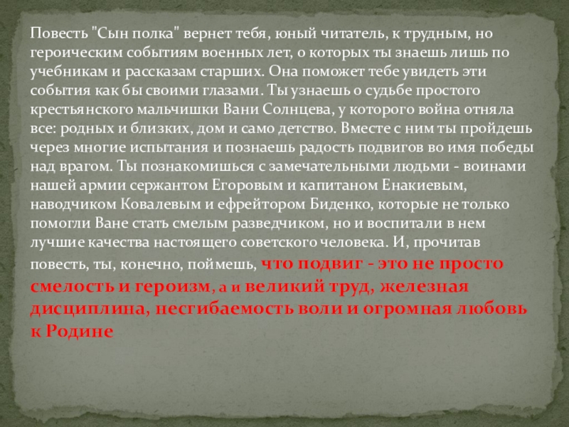 Слайд 5Повесть "Сын полка" вернет тебя, юный читатель, к трудным, но героическим