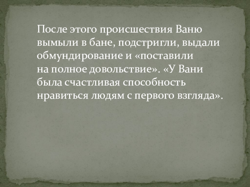 Слайд 17После этого происшествия Ваню вымыли в бане, подстригли, выдали обмундирование и «поставили на полное