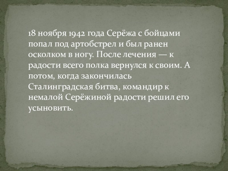 был ранен осколком в ногу. После лечения — к радости всего полка вернулся к своим. А потом, когда закончилась Сталинградская битва, командир к немалой Серёжиной радости решил его усыновить.
