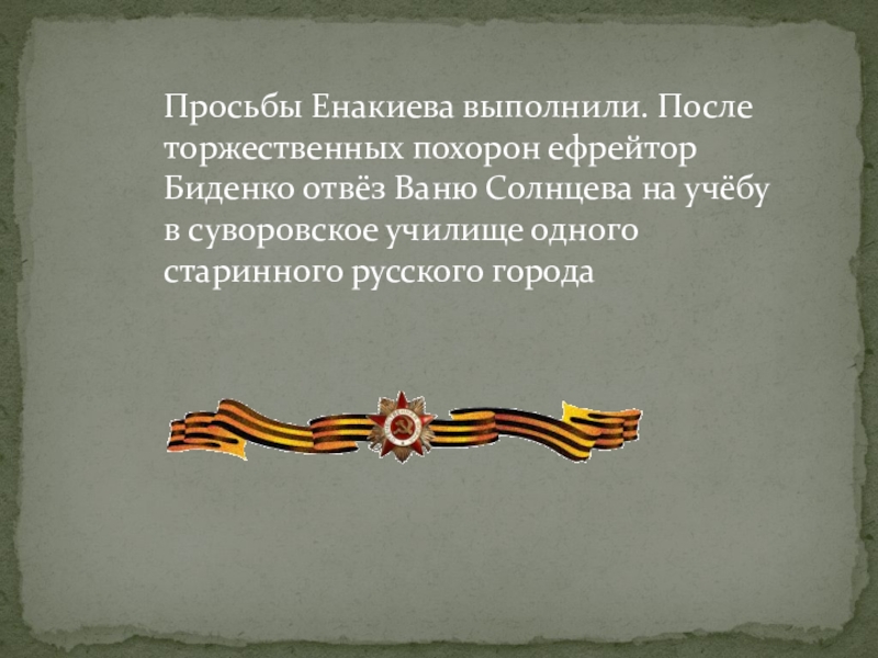 Слайд 24Просьбы Енакиева выполнили. После торжественных похорон ефрейтор Биденко отвёз Ваню Солнцева