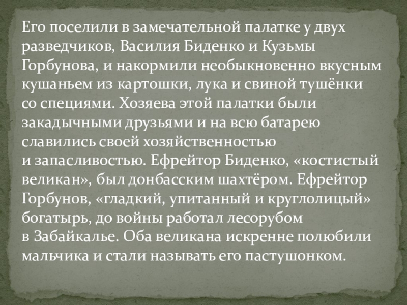 необыкновенно вкусным кушаньем из картошки, лука и свиной тушёнки со специями. Хозяева этой палатки были закадычными друзьями и на всю батарею славились своей хозяйственностью и запасливостью. Ефрейтор Биденко, «костистый великан», был донбасским шахтёром. Ефрейтор Горбунов, «гладкий, упитанный и круглолицый» богатырь, до войны работал лесорубом в Забайкалье. Оба великана искренне полюбили мальчика и стали называть его пастушонком.