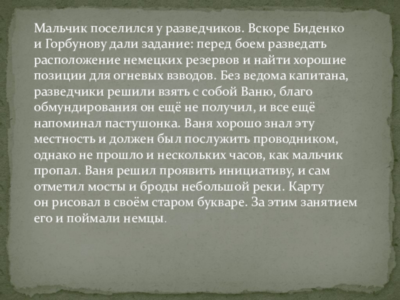 расположение немецких резервов и найти хорошие позиции для огневых взводов. Без ведома капитана, разведчики решили взять с собой Ваню, благо обмундирования он ещё не получил, и все ещё напоминал пастушонка. Ваня хорошо знал эту местность и должен был послужить проводником, однако не прошло и нескольких часов, как мальчик пропал. Ваня решил проявить инициативу, и сам отметил мосты и броды небольшой реки. Карту он рисовал в своём старом букваре. За этим занятием его и поймали немцы.