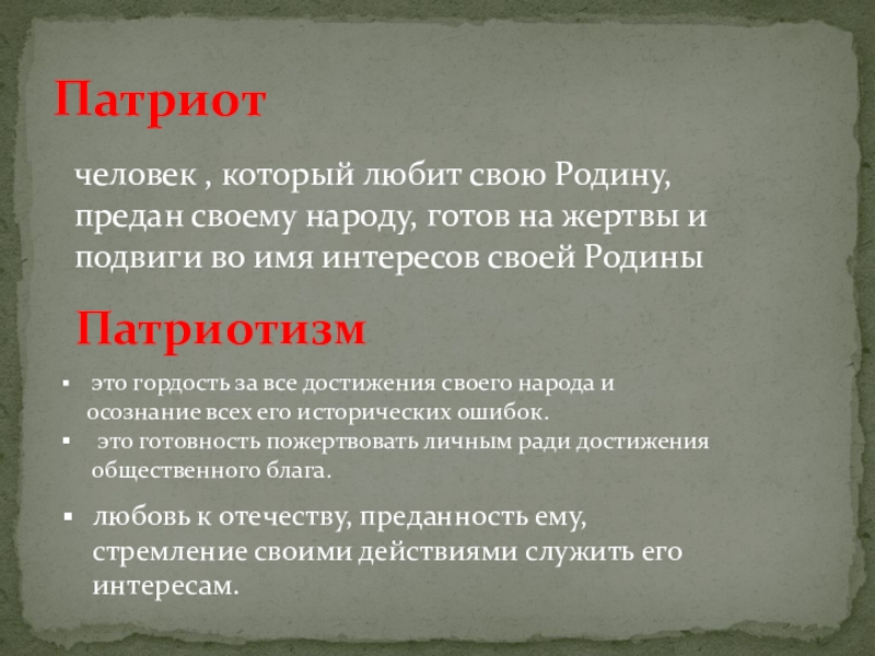 любовь к отечеству, преданность ему, стремление своими действиями служить его интересам.