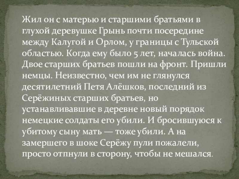 почти посередине между Калугой и Орлом, у границы с Тульской областью. Когда ему было 5 лет, началась война. Двое старших братьев пошли на фронт. Пришли немцы. Неизвестно, чем им не глянулся десятилетний Петя Алёшков, последний из Серёжиных старших братьев, но устанавливавшие в деревне новый порядок немецкие солдаты его убили. И бросившуюся к убитому сыну мать — тоже убили. А на замершего в шоке Серёжу пули пожалели, просто отпнули в сторону, чтобы не мешался.