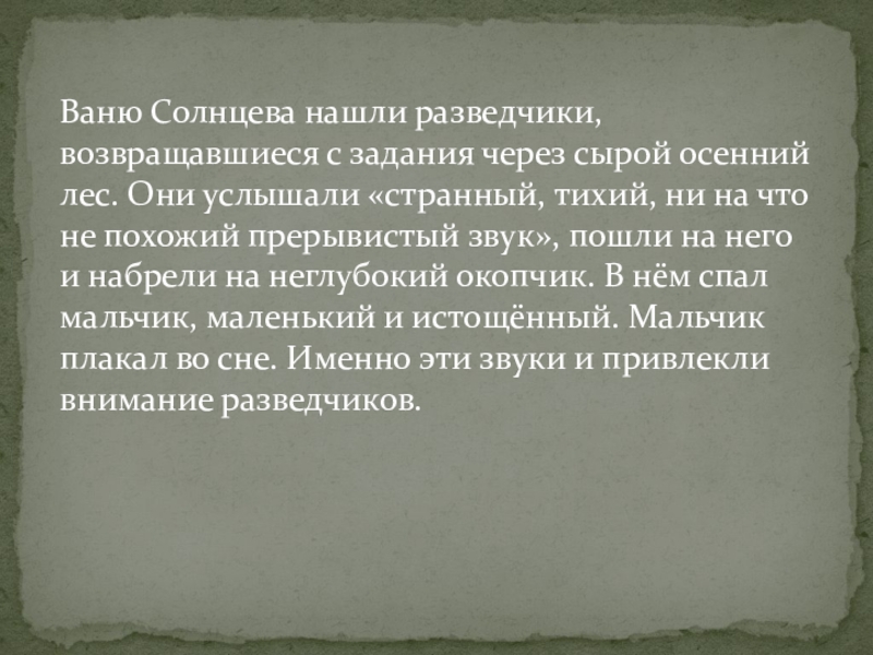 Слайд 6Ваню Солнцева нашли разведчики, возвращавшиеся с задания через сырой осенний лес. Они