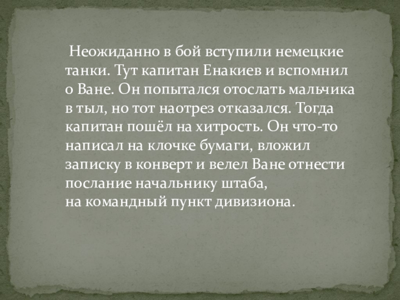 Слайд 20 Неожиданно в бой вступили немецкие танки. Тут капитан Енакиев и вспомнил о Ване.