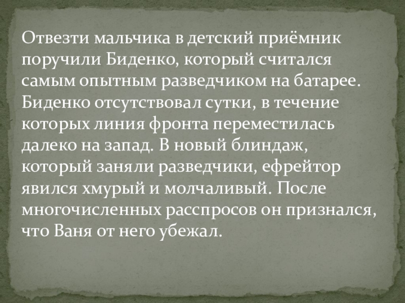 Слайд 11Отвезти мальчика в детский приёмник поручили Биденко, который считался самым опытным разведчиком